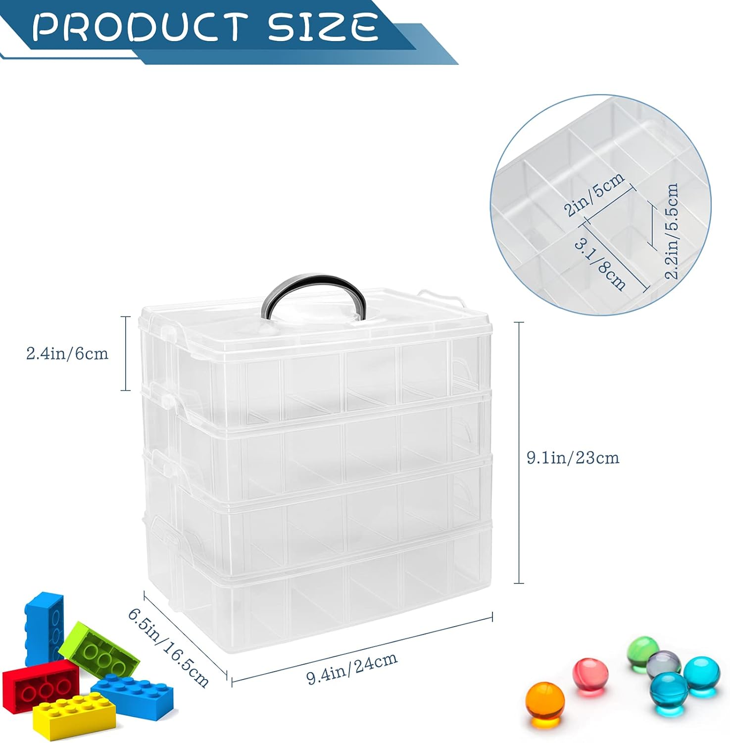 - 【Adjustable Dividers】Outer box size 9.4"L x 6.5"W x 9.1"H, single grid size: 3.1"L x 2.0"W x 2.2"H. Awesome Organizer Dividers are removable and detachable for custom compartment sizes to fit any size of toys or accessories.